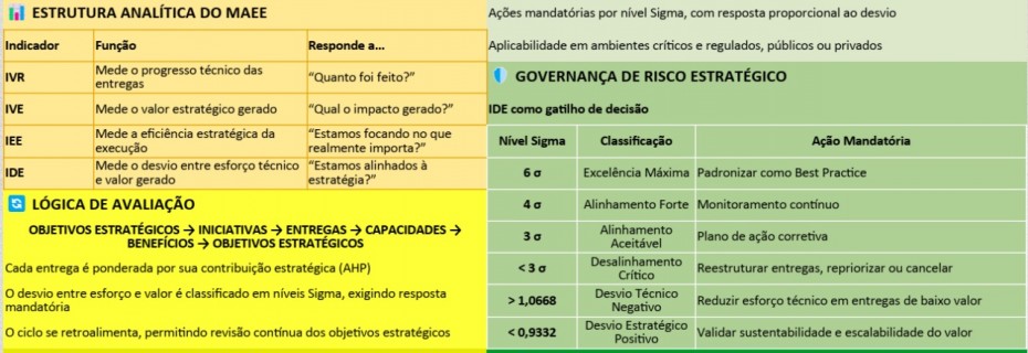 O MAEE, por meio do Índice de Desvio Estratégico (IDE), transforma a avaliação de portfólios,  programas e projetos de uma abordagem centrada em entregas para uma abordagem centrada em Qualidade da Performance Estratégica (Nível Sigma), fundamental para o controle da variância e a gestão da excelência.